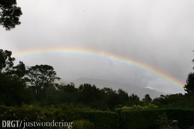 As has happened many times in our long relationship, my husband came through the bedroom where I was busily writing or reading and said, “You need to come outside and take a look at this – right now!” And there was this enormous rainbow, just shimmering out there. I grabbed my camera quickly, not looking at the lens first and snapped about a dozen pictures. By the time I finished snapping, the bow was gone. Too bad I didn’t wipe that filter off first! So, I’m sorry about the spots here and there – but I think  you get the size and brightness of this beautiful reminder of beauty in the midst of stormy weather. Somehow fitting for this psalm.